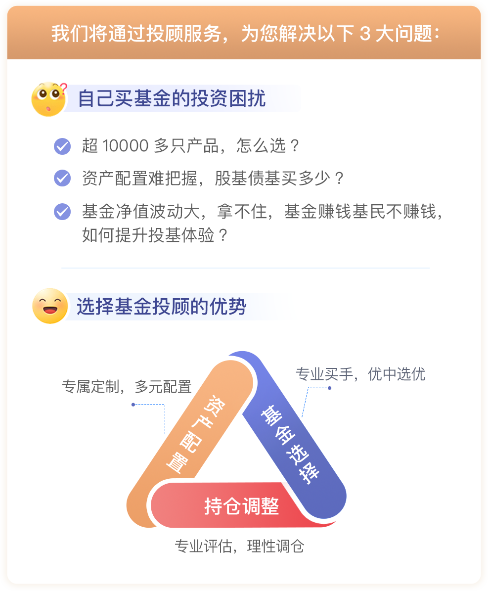 風險提示:本公司承諾本著勤勉盡責、誠實守信的原則,為投資者提供基金投顧服務,但不保證各投顧組合一定盈利,不保證最低收益,也不保證投資者所選擇的投資組合策略能夠達到投資者期望的投資收益目標。投資者參與基金投資顧問業務,存在本金虧損的風險,投資者自行承擔投資風險。投顧業務的過往業績并不預示其未來表現,為其他客戶創造的收益并不構成業績表現的保證?;鹜顿Y顧問業務尚處于試點階段,存在因試點資格被取消不能繼續提供服務的風險。