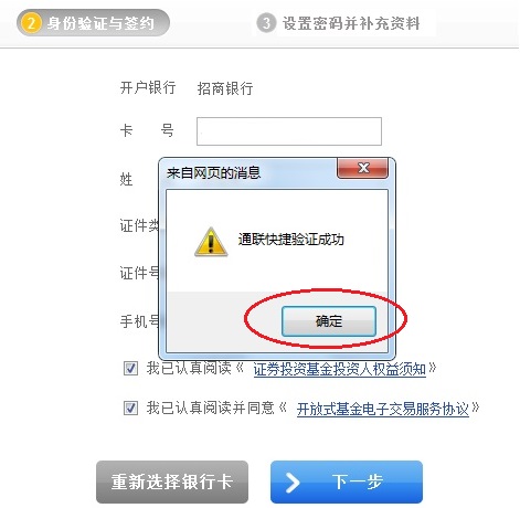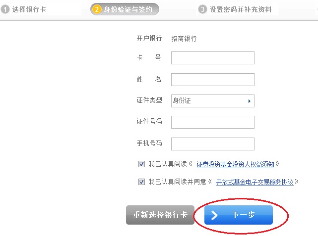 3. 進行“身份驗證與簽約”(您所輸入的姓名、證件類型、證件號碼、手機號碼必須與您在招商銀行辦理銀行卡時所留的信息完全一致)、銀行卡卡號,然后點擊“下一步”按鈕;
