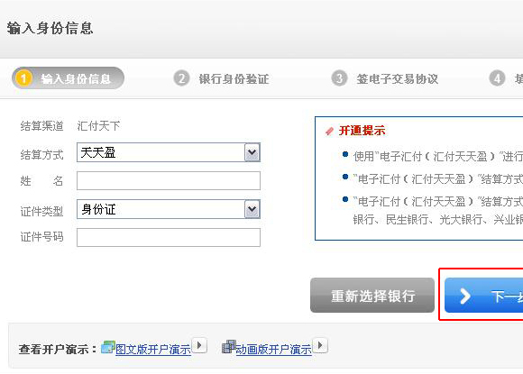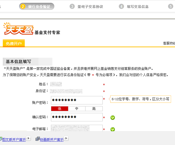 4、填寫相應信息開通天天盈賬戶,并選擇綁定結算銀行卡;