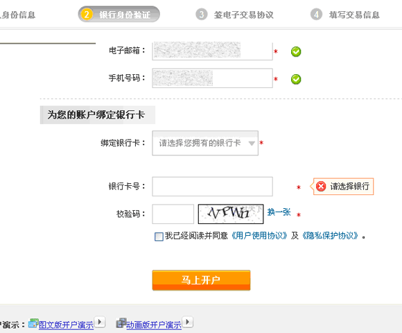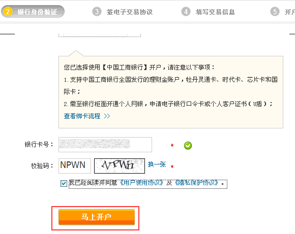 6、填寫綁定結算銀行卡卡號,并勾選同意《用戶使用協議》及《隱私保護協議》,點擊“馬上開戶”按鈕。