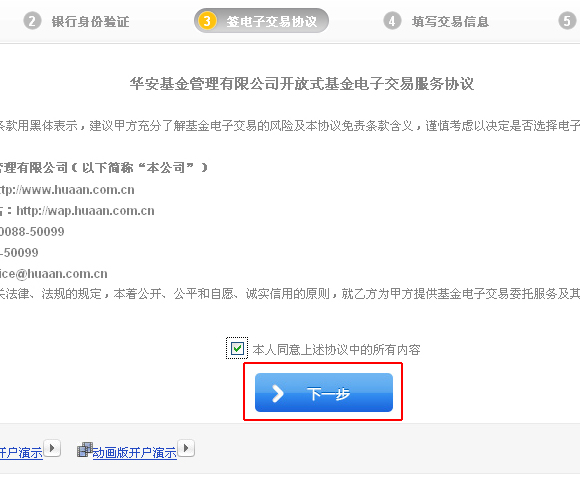 8、在線簽署《華安基金管理有限公司開放式基金電子交易服務協議》,客戶閱讀該協議后,勾選“本人同意上述協議中的所有內容”,然后點擊“下一步”按鈕;