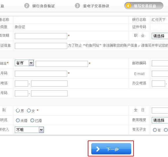 3、輸入姓名、證件類型、證件號碼,然后點擊“下一步”按鈕;