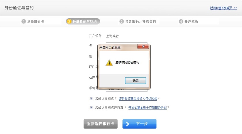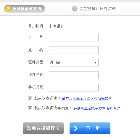 3. 進行“身份驗證與簽約”(您所輸入的姓名、證件類型、證件號碼、手機號碼必須與您在上海銀行辦理銀行卡時所留的信息完全一致)、銀行卡卡號,然后點擊“下一步”按鈕;