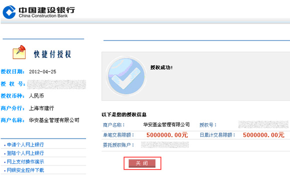 g) 頁面顯示以下信息,表示建行“e付通”已簽約成功;點擊“關閉”后,需要返回華安網上交易系統開戶頁面,繼續完成開戶流程;