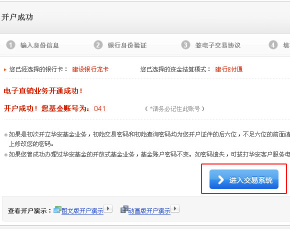 9、獲得您的基金賬號之后,可直接點擊“進入交易系統”進行網上交易。