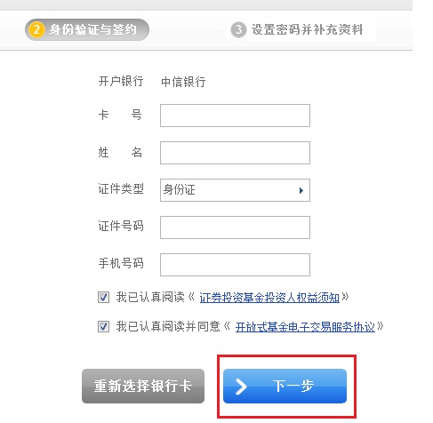 3. 進行“身份驗證與簽約”(您所輸入的姓名、證件類型、證件號碼、手機號碼必須與您在中信銀行“柜臺”辦理銀行卡時所留的信息完全一致)、銀行卡卡號,然后點擊“下一步”按鈕;