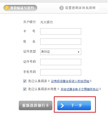 3. 進行“身份驗證與簽約”(您所輸入的姓名、證件類型、證件號碼、手機號碼必須與您在光大銀行辦理銀行卡時所留的信息完全一致)、銀行卡卡號,然后點擊“下一步”按鈕;