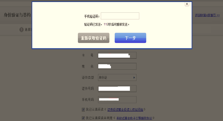 4.利用在銀行預留的手機號碼,進行身份驗證,驗證成功后進入下一步 ;
