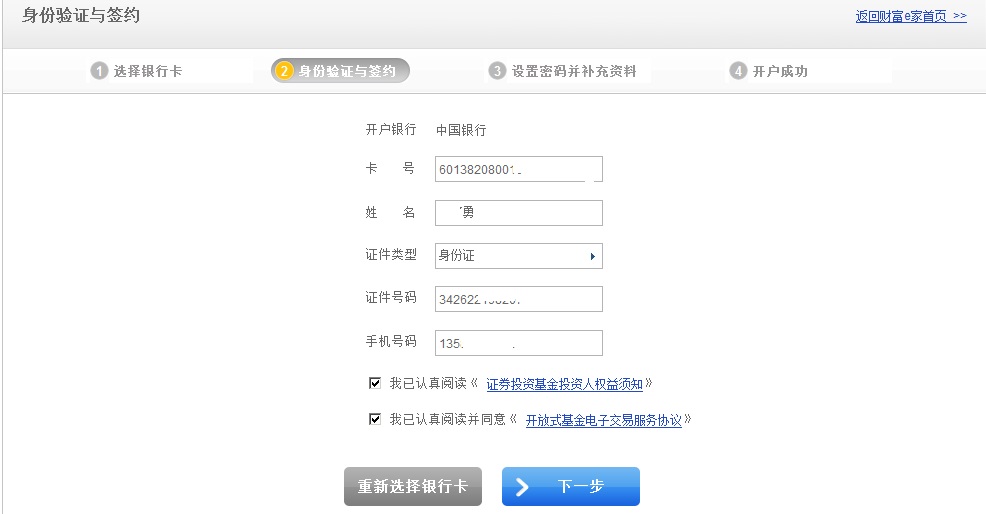 3. 進行“身份驗證與簽約”(您所輸入的姓名、證件類型、證件號碼、手機號碼必須與您在中國銀行辦理銀行卡時所留的信息完全一致)、銀行卡卡號,然后點擊“下一步”按鈕;