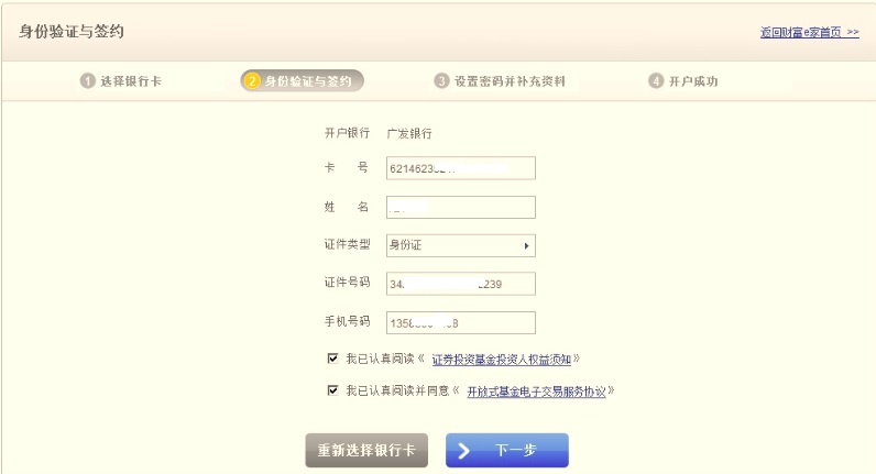 3. 進行“身份驗證與簽約”(您所輸入的姓名、證件類型、證件號碼、手機號碼必須與您在廣發銀行辦理銀行卡時所留的信息完全一致)、銀行卡卡號,然后點擊“下一步”按鈕;