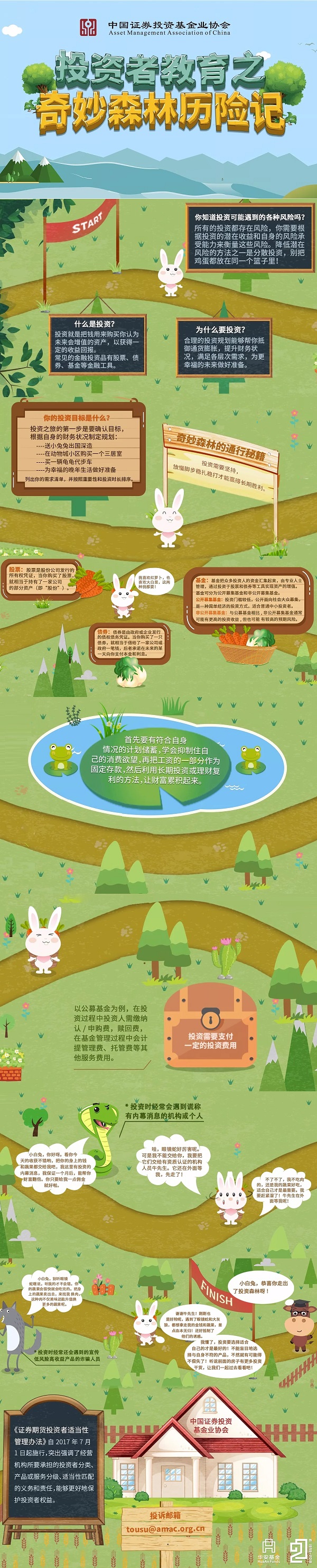 相信許多剛剛接觸投資或者缺乏投資專業知識的朋友對于上述問題并不了解。中國證券投資基金業協會在3·15特別策劃、推出以“奇妙森林歷險記”為主題制作的投資者教育路線圖,將主人公小白兔經過投資森林一路遇到的投資知識點、常見騙局等事件串聯起來,以簡單有趣的畫面教您投資基礎知識,不再做小白。