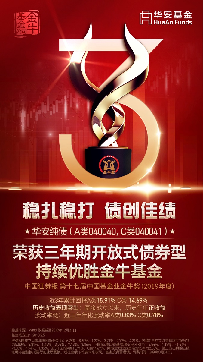 固收產品方面,此次榮獲“三年期開放式債券型持續優勝金?;?rdquo;獎的華安純債成立時間久,歷史業績優異。這只基金僅投資于債券資產,精選個券把握債市機遇,成立運作7年多來,也經歷了2013年債熊、2018年債牛等不同市場環境的考驗。WIND數據顯示,截至2019年底,華安純債A近3年收益率15.92%,排名同類前1/6,且在2013年-2019年中連續7個年度實現正回報。