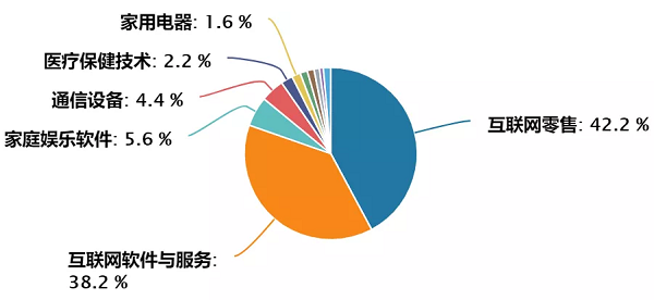 恒生科技指數優選30家最大的港股科技企業,主要涉及網絡、金融科技、云端、電子商貿及數碼業務等。按照Wind四級行業分類,行業權重排名靠前的是互聯網零售(42.2%)、互聯網軟件與服務(38.2%)、家庭娛樂軟件(5.6%)、通信設備(4.4%)。