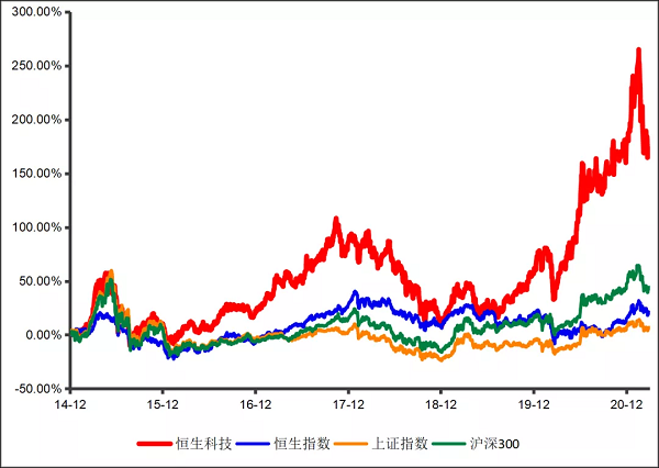 因為重倉的科技公司盈利能力突出,恒生科技指數具備較高成長性,基本面過硬。對比恒生科技指數和恒生指數,恒生科技指數最新財年的營收增速為24.2%,顯著高于恒生指數的10.5%(數據來源:Wind,中信證券,截至2020年12月31日)。基于科技屬性和優秀的基本面表現,恒生科技指數具備較強進攻性,在科技行情中超額收益顯著,長期成長性優秀。如下圖所示,從指數基日2014年12月31日2021年3月31日,恒生科技指數回報率顯著領先恒指、滬深300和上證指數,體現了港股科技股的優良質地。