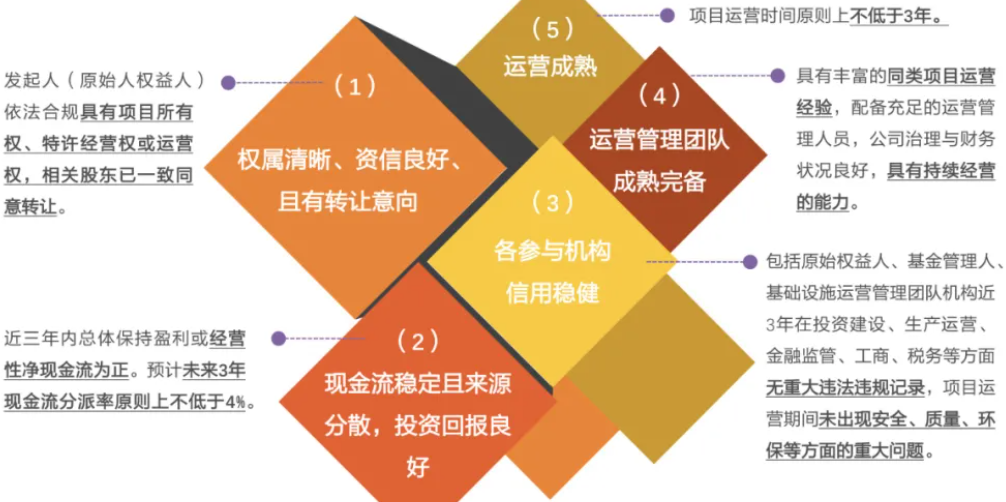 根據《關于推進基礎設施領域不動產投資信托基金(REITs)試點相關工作的通知》、《公開募集基礎設施證券投資基金指引(試行)》,我國基礎設施公募REITs試點項目具有以下要求: