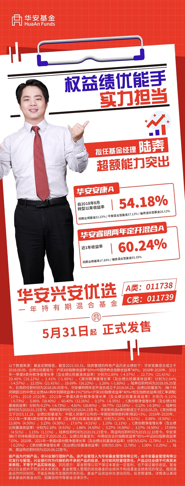 這次的新基金也將延續陸奔良好的投資理念和管理操作。華安興安優選一年主打股債平衡配置,風險收益水平低于偏股混合型基金和股票型基金,高于“固收+”策略的基金,適合既想抓住股市投資機會,又希望收益波動相對較低的投資者。同時,該基金設置了一年的持有期,即投資者投入的每一筆資金都須持有滿一年時間,這樣有利于投資者避免市場情緒影響而產生追漲殺跌等非理性投資行為,通過耐心、長期持有把握基金的長期回報。