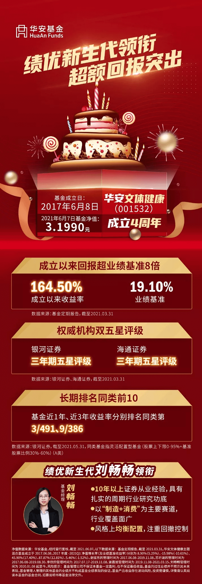 除此之外,該基金近1年、近3年排名同類前十,獲得權威機構雙五星評級,截至2021年6月7日最新凈值達3.199元,交出了一份出色的四周年成績單。