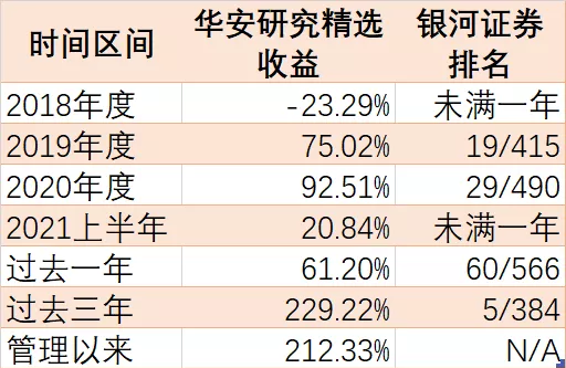 應該說,得益于2019年和2020年基礎市場行情不錯,基金經理基本能夠取得令持有人滿意的收益。但是今年以來市場行情跌宕起伏,尤其是春節后的大幅調整,使得不少基金經理在上半年的操作中不僅沒有實現正收益,甚至都跑輸大盤主要指數。雖然我們并不提倡過多關注短期、甚至是超短期業績,但凈值表現依然能夠反映出基金經理在這段時期的操作以及前期布局的有效性。應該說,繼2019年、2020年取得超高收益率之后,今年以來萬建軍表現依然相當優秀,華安研究精選取得了20.84%的漲幅。(截至2021/6/30 銀河證券數據)