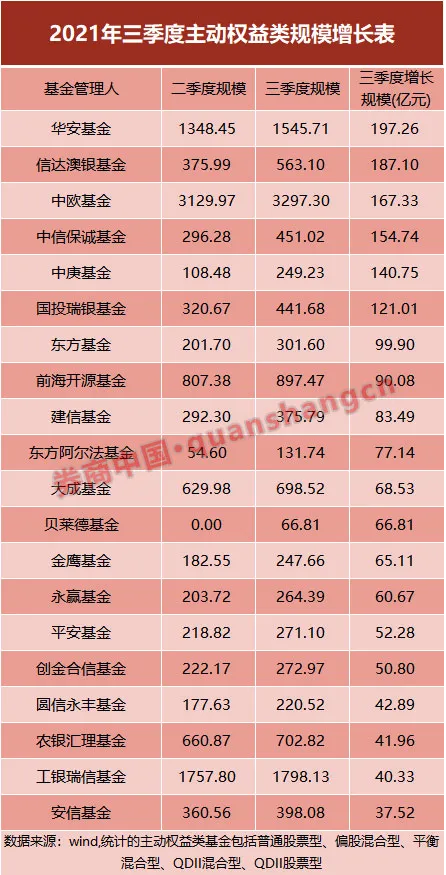 極致行情下,愈發考驗機構投資者的主動權益投研實力。數據統計發現,今年三季度,主動權益規模增長超百億的基金公司有,華安基金、信達澳銀基金、中歐基金、中信保誠基金、中庚基金、國投瑞銀基金,其中華安基金以197.26億的規模增長量位列行業榜首,表現分外搶眼!