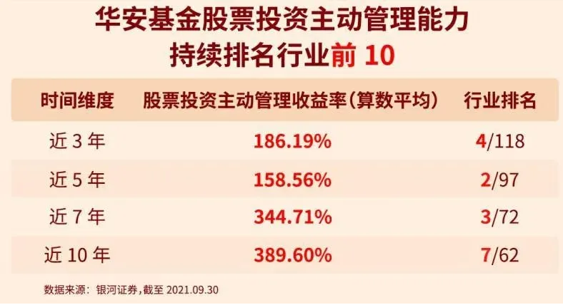 我們先看一組銀河證券的長期數據,華安基金近3年、近5年、近7年、近10年的股票投資主動管理能力均位列行業前十。截至2021年9月30日,華安基金近3年股票投資主動管理平均收益率近3年達186.19%,行業排名4/118;近5年主動管理平均收益率達158.56%,行業排名2/97;近7年主動管理平均收益率達344.71%,行業排名3/72;近10年主動管理平均收益率達389.60%,行業排名7/62。