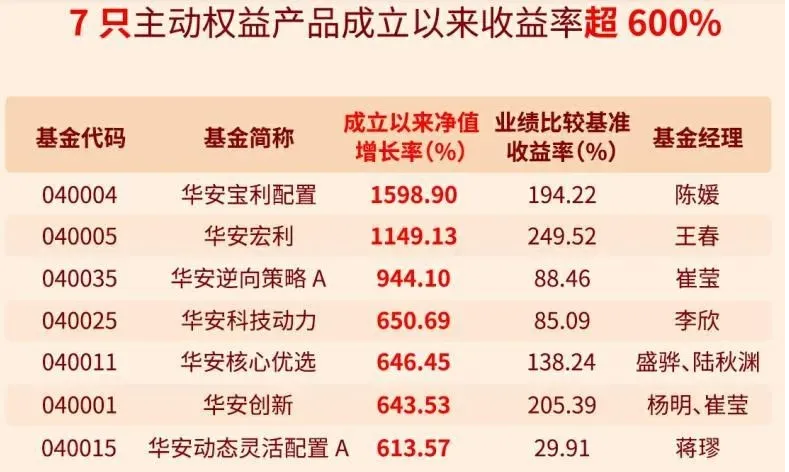 還有7只主動權益產品成立以來收益率超600%,分別是華安寶利配置、華安宏利、華安逆向策略、華安科技動力、華安核心優選、華安創新、華安動態靈活策略,歷經市場多輪牛熊的洗禮,這些產品的持有人都收獲了時間的玫瑰。