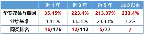截至2021年12月31日,華安媒體互聯網近5年收益率達213.37%,在近1年,3年和5年的時間里,均排名同類前10%。