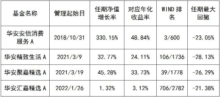 來看看王斌目前在管的4只基金,其最早接手的華安安信消費服務當然是代表作,2021年到今年年初,他又陸續接管3只產品,分別是華安精致生活、華安聚嘉精選和華安匯嘉精選。