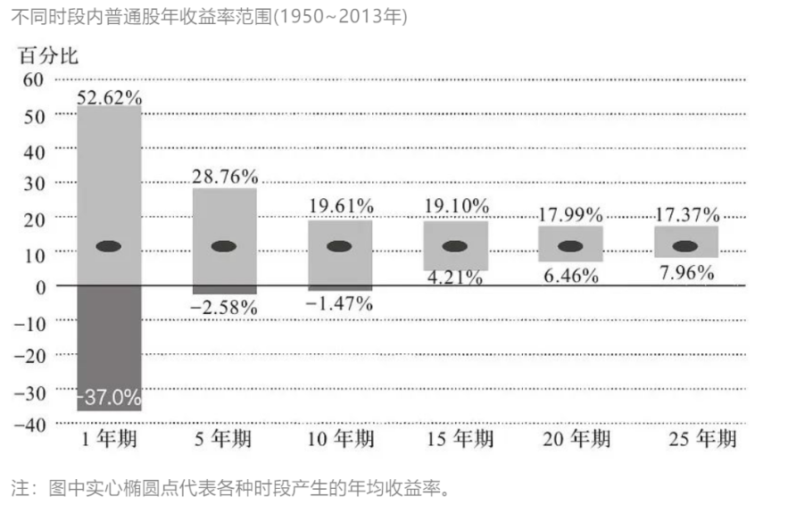 如《漫步華爾街》對1950年到2013年不同時間段內普通股的投資收益統計,可以看到,持有權益資產的時間越長,遭受損失的可能性也越小,同時收益率范圍逐漸收斂。