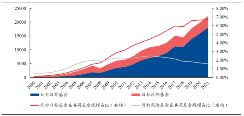 以美國為例,截至2021年底,美國共同基金中養老目標基金已經達到了2.23萬億美元,其中養老目標日期基金規模達1.8萬億美元,目標風險基金達0.4萬億元,為各類DC計劃和IRA賬戶所廣泛采用。