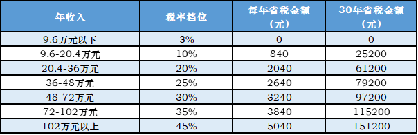 在稅前扣除五險一金、每月專項附加扣除后,年收入高于9.6萬元的人群,會有明顯的省稅優惠。收入越高,省稅的額度就越多,每年最多可以省5040元,累計30年可省金額超15萬元!