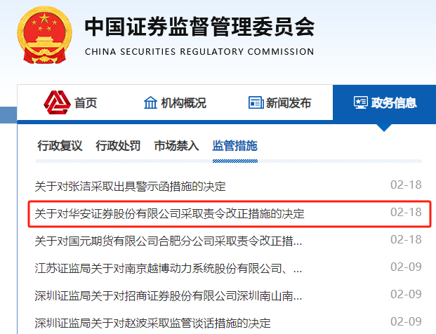 2月18日,證監會官網公布3份行政監管措施。其中,華安證券被安徽證監局采取責令改正的行政監管措施。