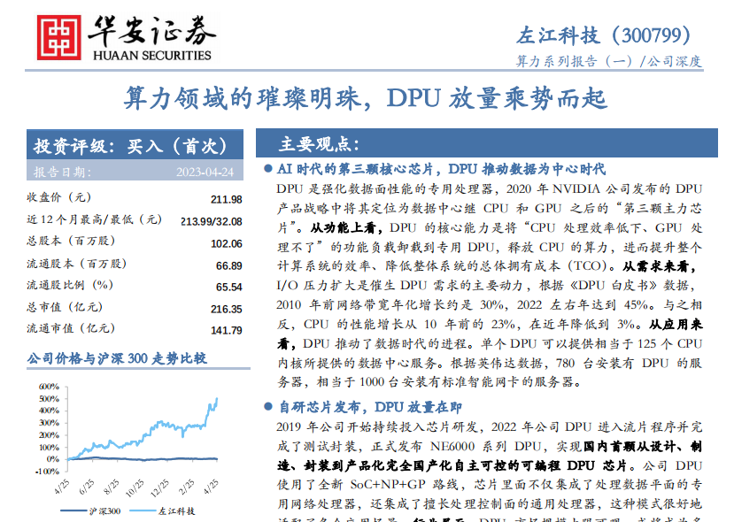 2023年1月31日、2月25日、3月25日,*ST左江連續三次發布公司股票交易可能被實施退市風險警示的公告。但在2023年4月25日,華安證券發布了題為《算力領域的璀璨明珠,DPU放量乘勢而起》的深度研究報告,并推薦買入左江科技。