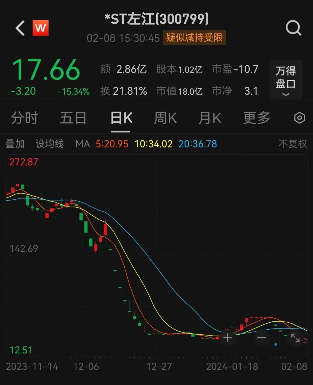 1月30日晚間,*ST左江發布業績預告,公司預計2023年凈利潤虧損1.6億元至2.25億元,虧損額度進一步擴大,上年同期為虧損1.47億元。此后,*ST左江多日走出“20CM”跌停。至2月8日收盤,*ST左江股價僅余17.66元/股。