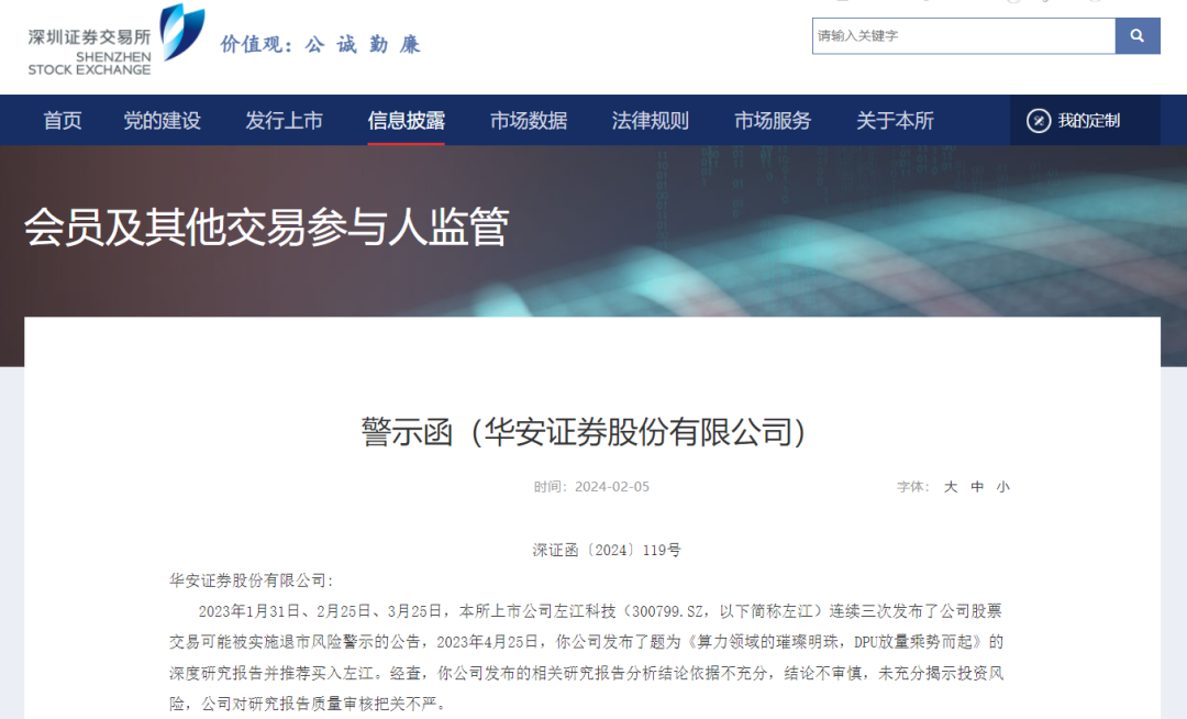 2月5日,深交所對華安證券出具警示函。深交所認為,華安證券發布的相關研究報告分析結論依據不充分,結論不審慎,未充分揭示投資風險,公司對研究報告質量審核把關不嚴。