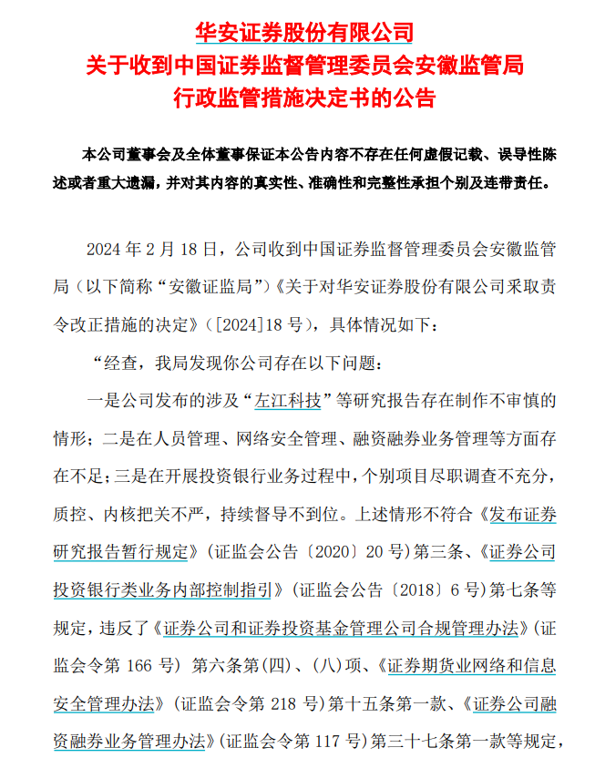 2月18日晚間,華安證券及時公布了收到安徽證監局行政監管措施決定書的消息。