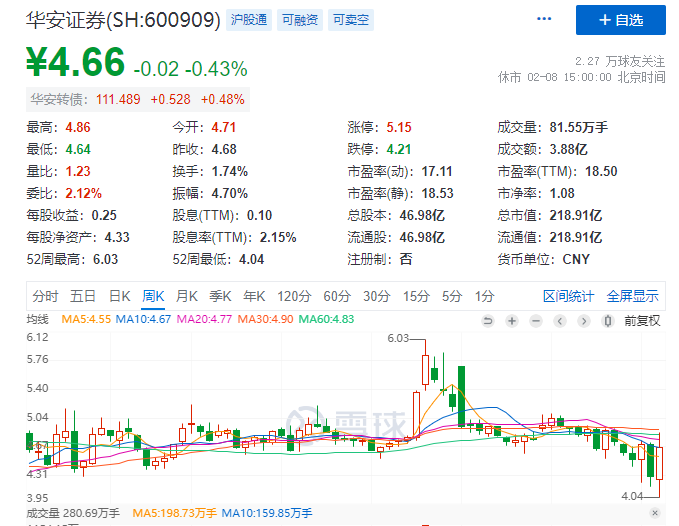 截至2月8日收盤,華安證券股價為4.66元/股,總市值為219億元。
