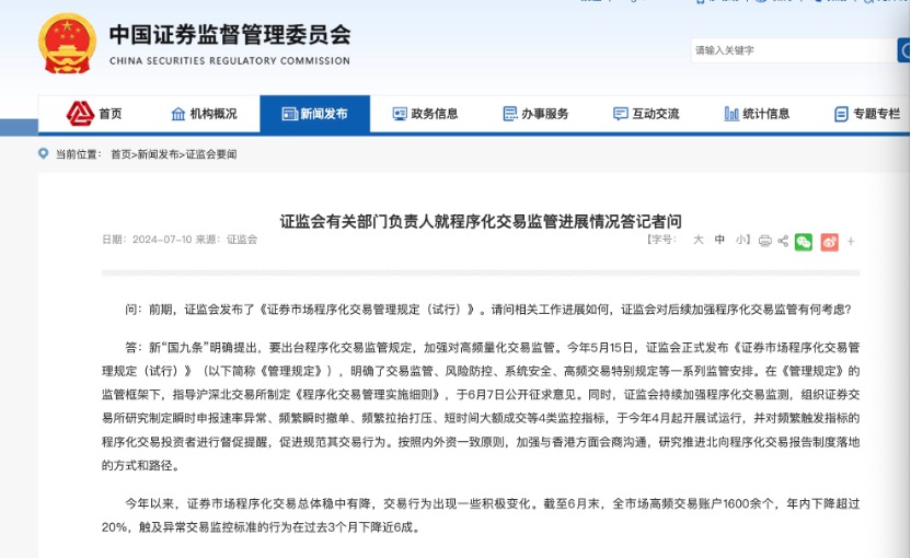 7月10日,證監會有關部門負責人就程序化交易監管進展情況答記者問,就當前量化監管工作進展、后續強化監管的考慮做出了回應。