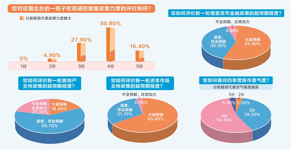 調查還顯示,對于一攬子增量貨幣金融政策與資本市場支持政策,分別有55.8%和65.6%的受訪者認為政策力度大超預期。對于房地產支持政策,有60.7%的受訪者認為政策力度符合預期。