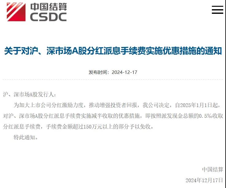 今日,中國結算發布消息稱,為加大上市公司分紅激勵力度,推動增強投資者回報,中國結算決定,自2025年1月1日起,對滬、深市場A股分紅派息手續費實施減半收取的優惠措施,即按照派發現金總額的0.5‰收取分紅派息手續費,手續費金額超過150萬元以上的部分予以免收。