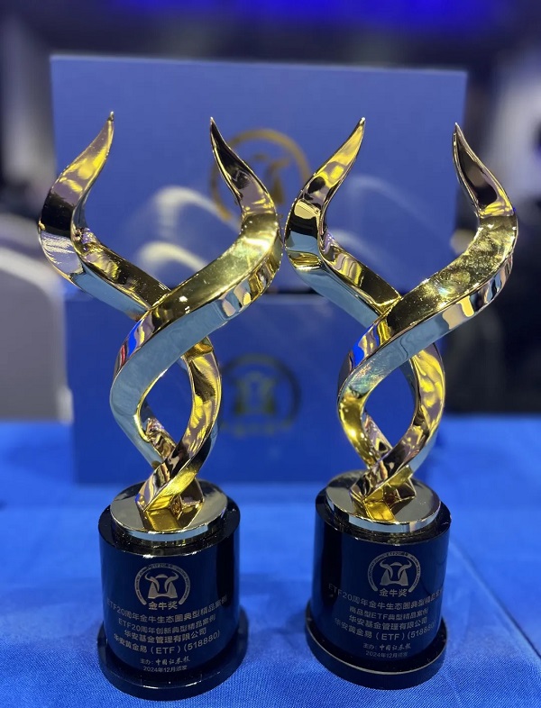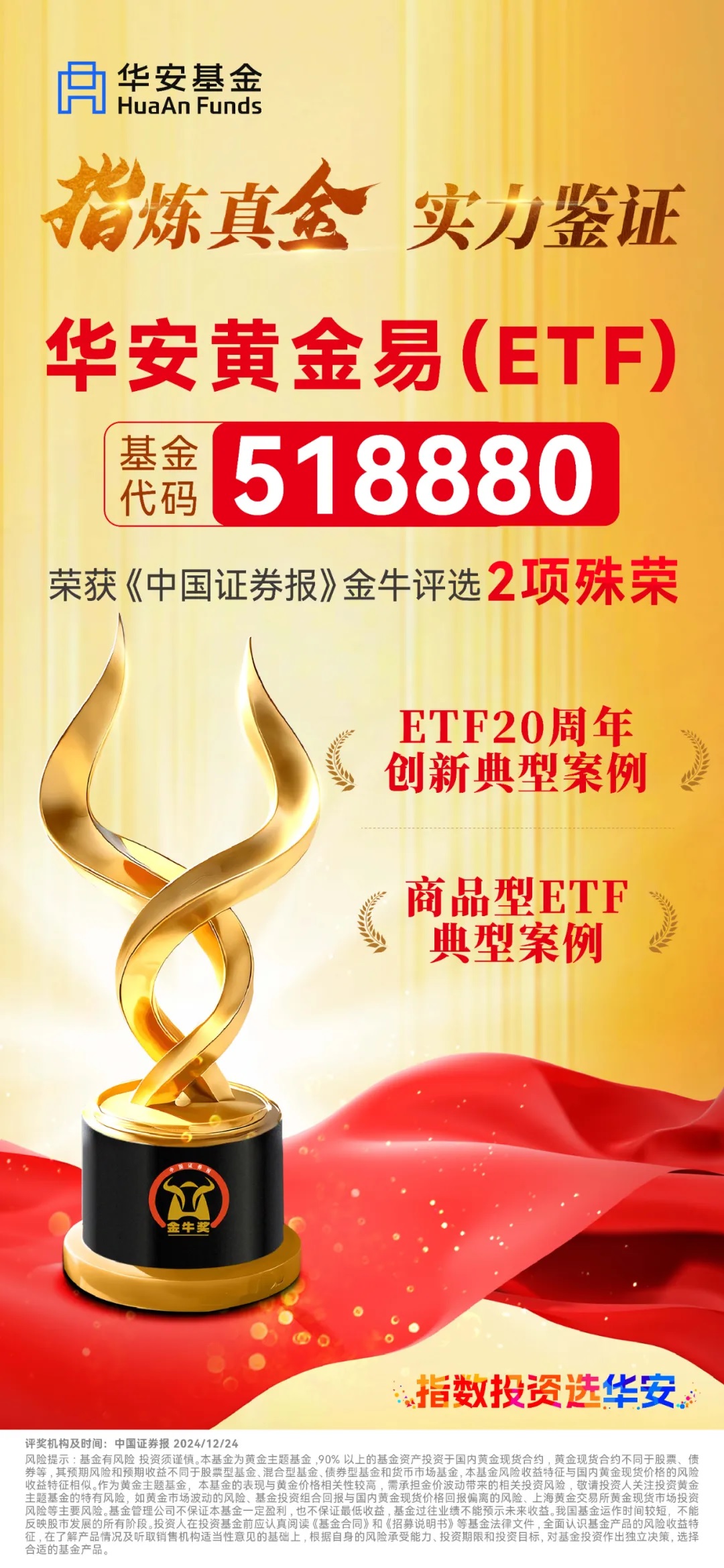 12月24日,中國證券報舉辦了ETF20周年金牛生態圏典型案例頒獎典禮,華安黃金易(ETF)(518880)榮獲ETF20周年創新典型案例、商品型ETF典型案例兩項大獎。華安基金深耕指數基金領域,已有22年的指數產品管理經驗。